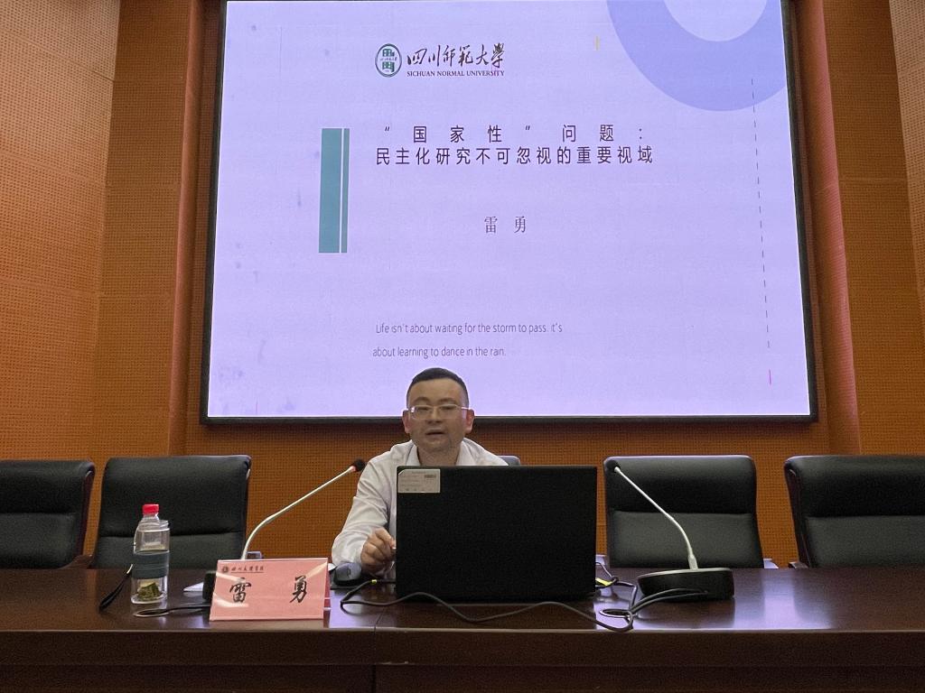 4月17日,四川师范大学雷勇教授应邀在我校学术报告厅B厅作题为《“国家性”问题:民主化研究不可忽视的重要视域》的学术报告。beat365正版唯一官网必一院长孙杰主持,beat365官网部分教师代表和政法学院部分学生聆听了讲座。