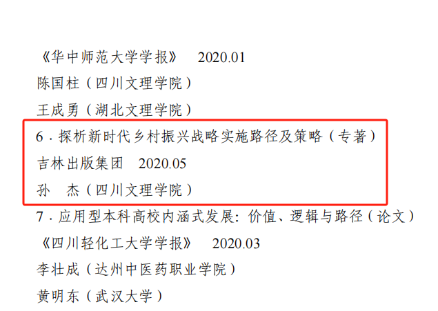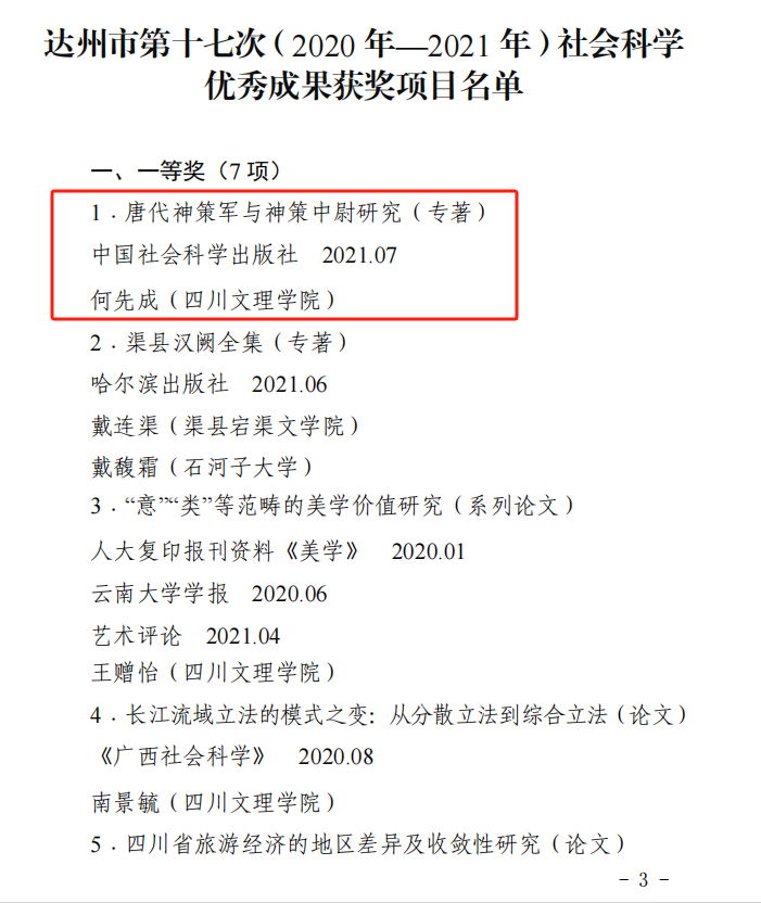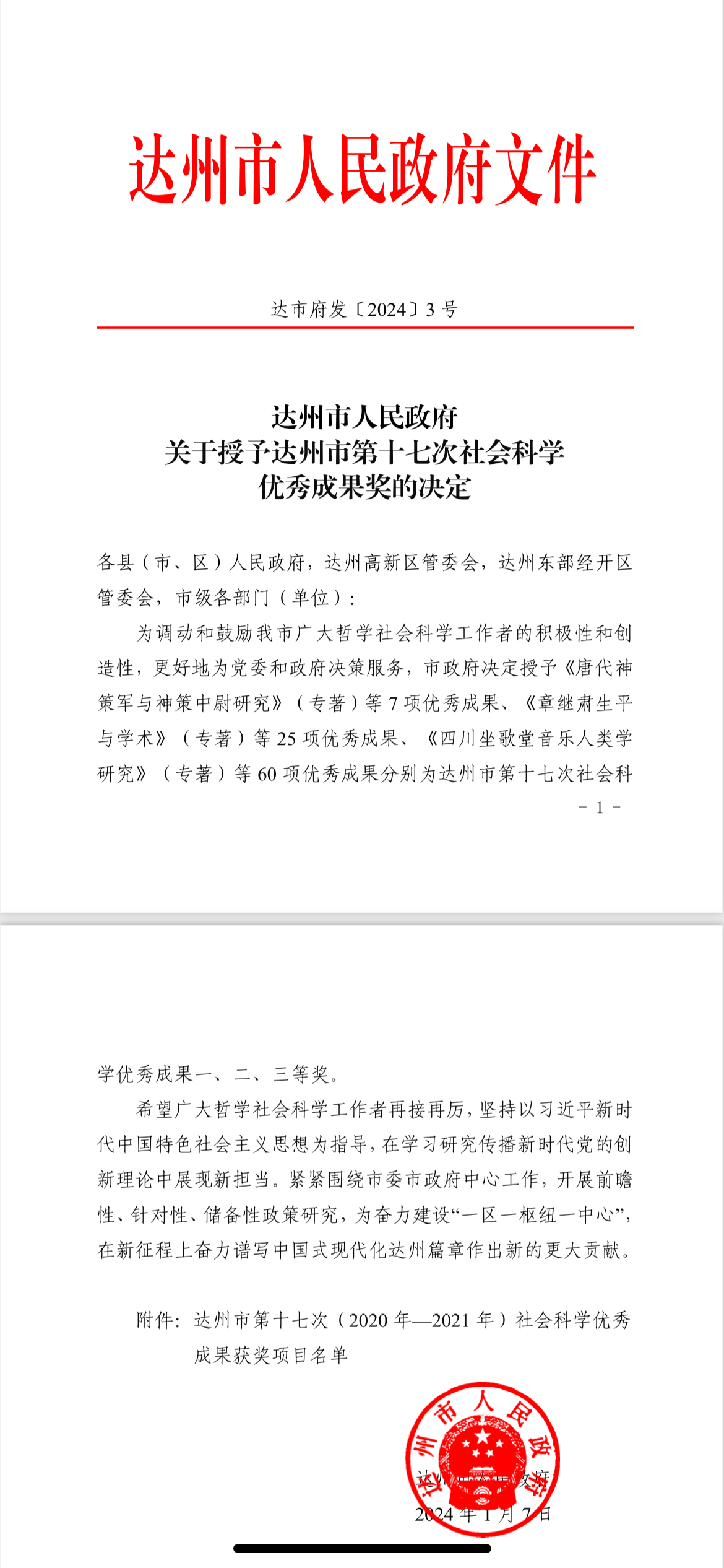 学院院长孙杰专著《探析新时代乡村振兴战略实施路径及策略》与学院副院长何先成专著《唐代神策军与神策中尉研究》荣获达州市第十七次社会科学优秀成果奖一等奖。张善喜老师论文《习近平劳动观的逻辑诠释荣获达州市第十七次社会科学优秀成果奖三等奖。