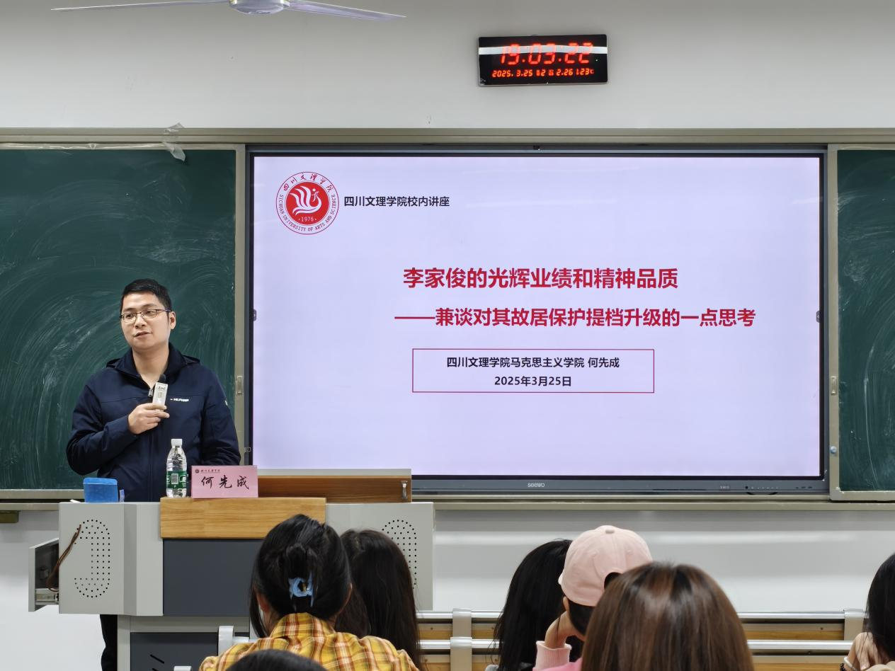 为提升院学生红色文化素养,2025年3月25日晚7点,学院副院长何先成研究员莲湖东区“李家俊的光辉业绩和精神品质——兼谈对其故居保护提档升级的一点思考”为题作学术讲座。思想政治教育专业学生现场聆听讲座。