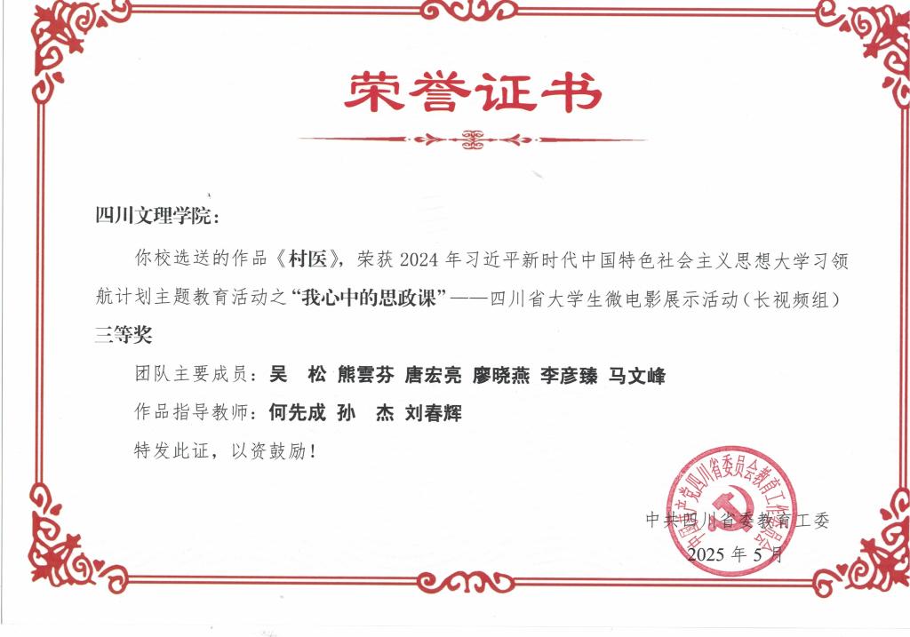 在“我心中的思政课”四川省大学生微电影展示活动(长视频组) 中,beat365官网选送的作品《村医》获三等奖。《村医》由吴松、熊雲芬、唐宏亮、廖晓燕、李彦臻、马文峰等同学组成创作团队,在何先成、孙杰、刘春辉三位教师的悉心指导下完成。影片聚焦基层医疗工作者扎根乡村、守护健康的感人事迹,以细腻的镜头语言和真实的故事呈现,生动诠释了基层工作者的使命与担当,将思政教育元素融入影像艺术之中。