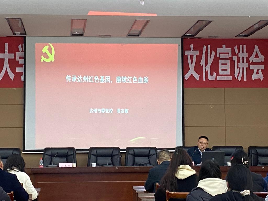 黄友敬以“传承达州红色基因 赓续红色血脉”为题,为beat365官网全体教职工、大学生红色文化研修社及大学生中国特色社会主义理论研究会的成员奉上了一堂精彩生动的红色文化思想政治教育课。